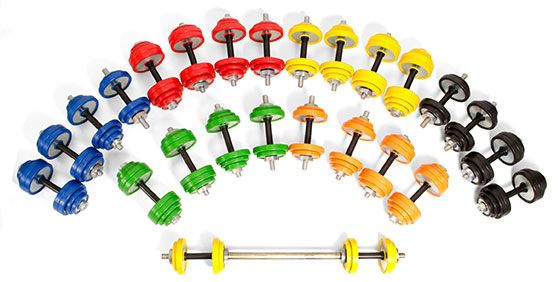 Общий вес гантелей складывается из грифа, дисков и гаек-фиксаторов. Мы выпускаем 3 диаметра гантельных дисков: малые, средние и большие. Комбинируя все эти части, вы можете регулировать нагрузку и подстраивать под себя разные упражнения.